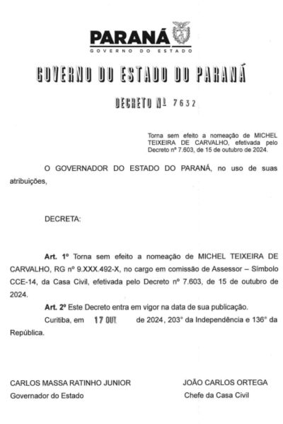 O vice-prefeito eleito, contudo, não atendeu às chamadas e mensagens particulares. No gabinete dele na Câmara, a informação referente à nomeação para a Casa Civil era desconhecida, conforme a assessoria dele. Pouco tempo depois que este Blog fez os questionamentos, a Casa Civil do Paraná informou a edição de um novo decreto sustando os efeitos da nomeação do Delegado Michel no governo. (confira abaixo).